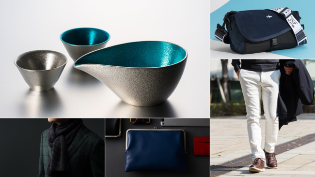 晩酌タイムがワンランク上がる富山県高岡市【能作】の錫(すず)の酒器セット、東京都墨田区【SAKURA WAQS】より職人技ひかる究極にスタイリッシュな「がま口」クラッチバック、見ているだけでもテンションが上がる6つの異素材をミックスさせる手法をカタチにした東京都足立区【DOUBLELOOP】の2WAYボディバッグなど職人・クリエイターの技ありな逸品。