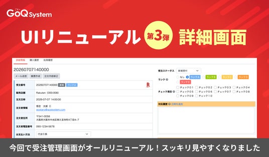 株式会社GoQSystem株式会社GoQSystem(本社:東京都中央区、代表取締役:藤本卓治)は、EC業務支援システム「GoQSystem」のUIリニューアルの第三弾として、「詳細画面」の新UIをリリースしました。