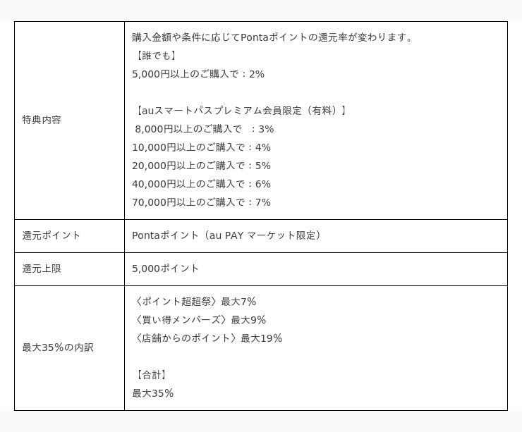■「ポイント超超祭」概要1.au PAY マーケット特典(1)最大35%還元キャンペーンページからエントリーのうえ、au PAY マーケットでお買い物いただくと、購入金額や条件に応じて最大7%のPontaポイント(au PAY マーケット限定)を還元します。