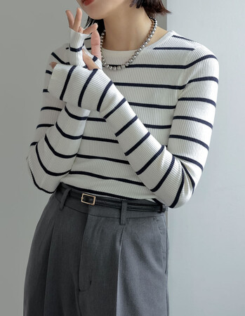 指穴クルーネックリブニットトップス