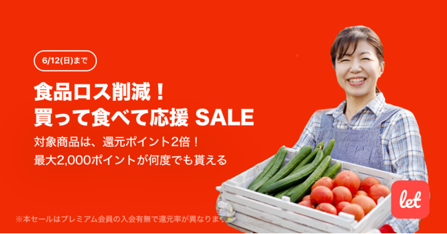 株式会社レット(本社:東京都港区、代表:佐藤 航陽)が運営する、食品ロス/在庫ロス削減のマーケット「Let(レット)」内で「食品ロス削減!買って食べて応援 SALE」を6月10日(金) 18:00より開催します。期間中、プレミアム会員様限定で対象の食品をご購入いただくと、2,000ポイントを上限に還元ポイントが2倍になります。期間中のご購入であれば、ポイント還元はお一人様あたり何度でもご利用いただけます。