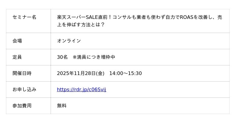 コンサルも業者も使わず自力でROASを改善し、売上を伸ばす方法とは?』オンラインセミナーを2025年11月28日(金)に開催します。