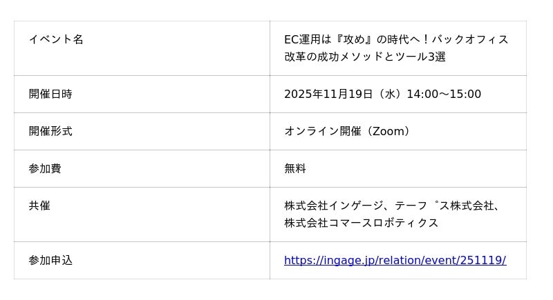 ◆開催背景とテーマEC市場の急速な拡大に伴い、受注処理、在庫管理、物流、そして顧客対応といったバックオフィス業務の煩雑化と属人化が深刻化しています。多くのEC事業者様にとって、この「見えない業務」の負荷が、本来注力すべきプロモーションやサービス改善へのリソース投入を阻み、成長の足かせとなっています。特に、人手不足が常態化する中、バックオフィス業務の効率化とデータ活用による「攻めの運用」への転換が、今後の競争優位性を確立する鍵となります。