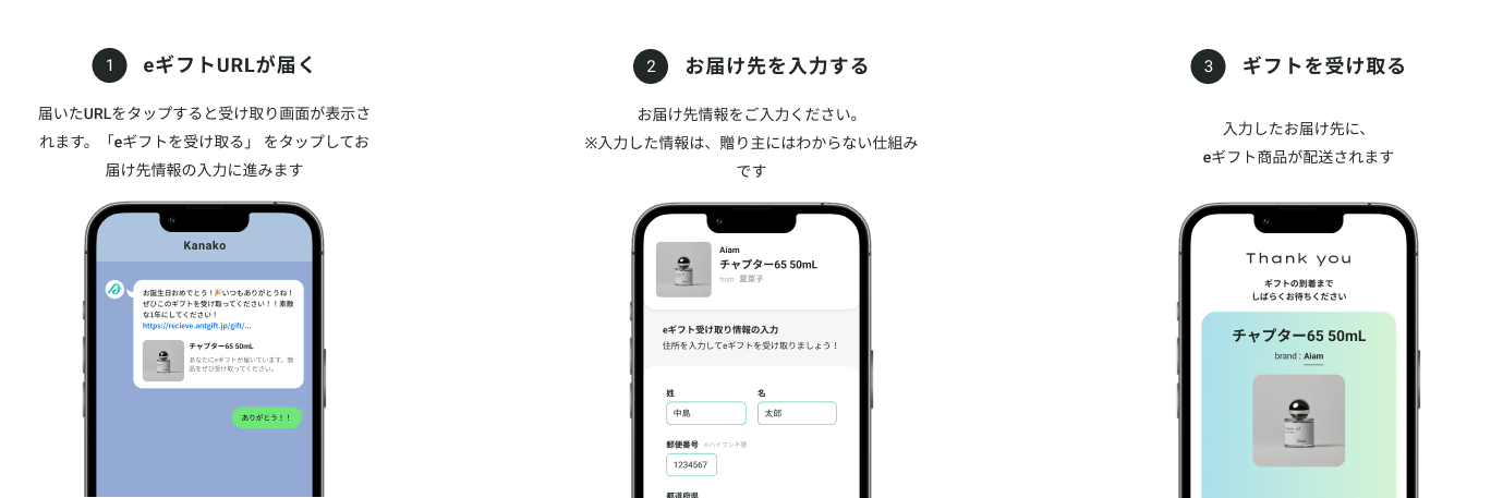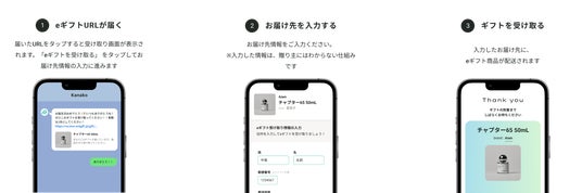 eギフトURLから住所を入力いただくだけで対象商品が届きます受け取りに会員登録は不要です。登録いただいた住所が贈り主に伝わる心配もございません。