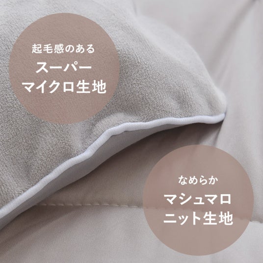 昨年から継続の通常モデルから引き継いだ「マシュマロニット生地」は、ほんのりヒンヤリと感じることも。そこでリバーシブル仕様の新モデルは片面に「スーパーマイクロ生地」を使い、