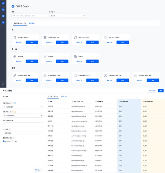 そしてこのたび、EC・店舗の顧客データ基盤「ecforce cdp」を開発しました。ecforce cdpは、社内外に存在する様々なデータを統合・可視化することで、データの利活用を促進します。統合したデータを基に顧客を分析し、最適なCRM施策を行うことで顧客体験の最大化を実現します。専門性を排除したシンプルな設計と、直感的で使いやすいユーザーインターフェースで、データアナリストなどの専門人材がいなくとも簡単に利用することができます。