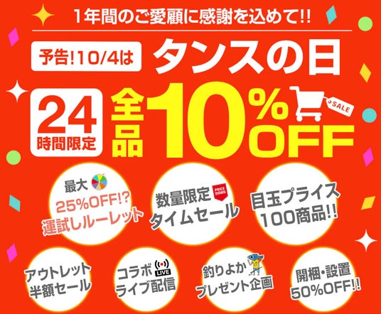 タンスのゲンは本店サイトにて10月4日(金)「タンスの日」にちなんだイベントを開催!お得なセールに加え、アウトレット品が半額で手に入る特別セールや「釣りよかでしょう。」とのコラボ配信やプレゼント企画も