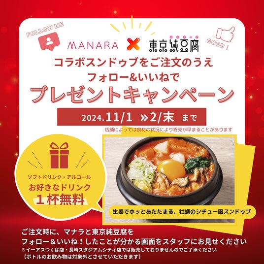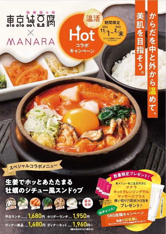 全国で人気のオリジナルブランド「マナラ」をはじめとした化粧品の開発及び販売を行う株式会社ランクアップ(本社:東京都中央区銀座代表取締役:岩崎裕美子)は、ビーンズワンカンパニー株式会社(本社:東京都大田区、代表取締役:平山 浩二)が運営する東京純豆腐(東京スンドゥブ)と初のタッグを組み、肌寒くなり冷えが気になる秋冬に向け、温活 Hotキャンペーン スペシャルコラボメニュー「生姜でホッとあたたまる、牡蠣のシチュー風スンドゥブ」を考案。2024年11月1日(金)から、全国30店舗以上の「東京純豆腐」で提供開始します。