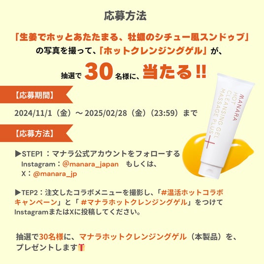 さらに、「マナラ ホットクレンジングゲル マッサージプラス 本製品」が当たるSNS投稿キャンペーンも併せて実施します。