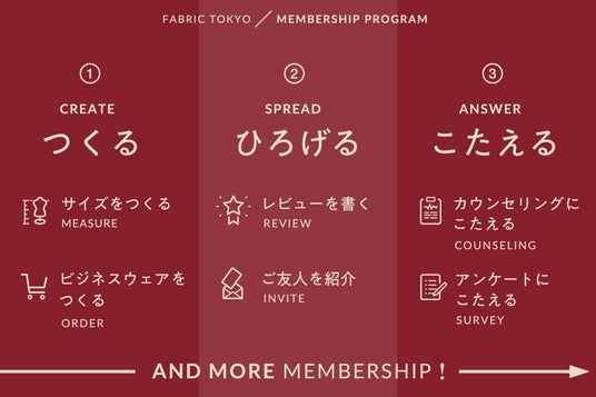 ご利用いただくほどに、FABRIC TOKYOのサービスを一層楽しめるプログラムとなっています。