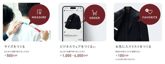 購入だけでなく、採寸やアンケートの回答、ご紹介などのアクションによりEXP(Experience Point)と呼ばれる経験値が貯まり、EXPの保有数に応じて会員ステージが決定します。