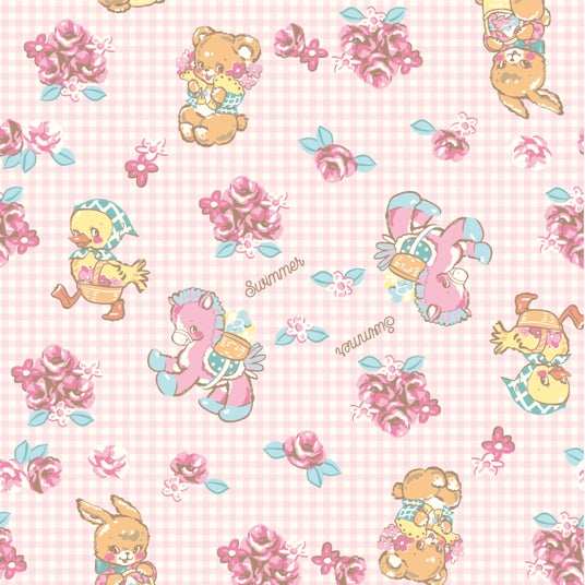 柄展開は全商品共通の「いちご」「アニマル」の2色展開。「いちご」は淡いベージュ地にいちごやさくらんぼなどの赤色が映える、かわいくてどこか懐かしい雰囲気があるデザインです。「アニマル」はピンクと白のギンガムチェックをベースに、スイマーらしいレトロな雰囲気の動物たちのイラスト等がちりばめられたノスタルジックでかわいいデザインになっています。