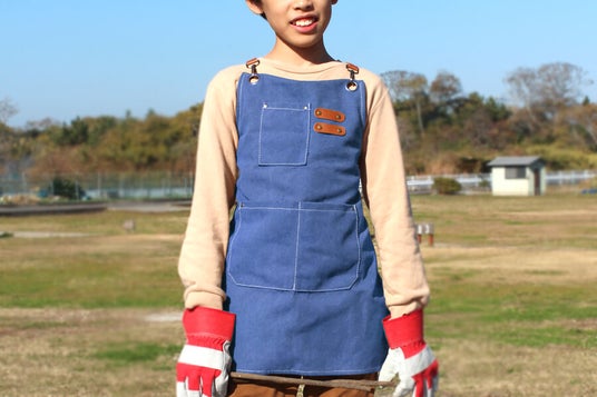 大きめのポケットに手袋などを収納できる厚手生地の子供用エプロン
