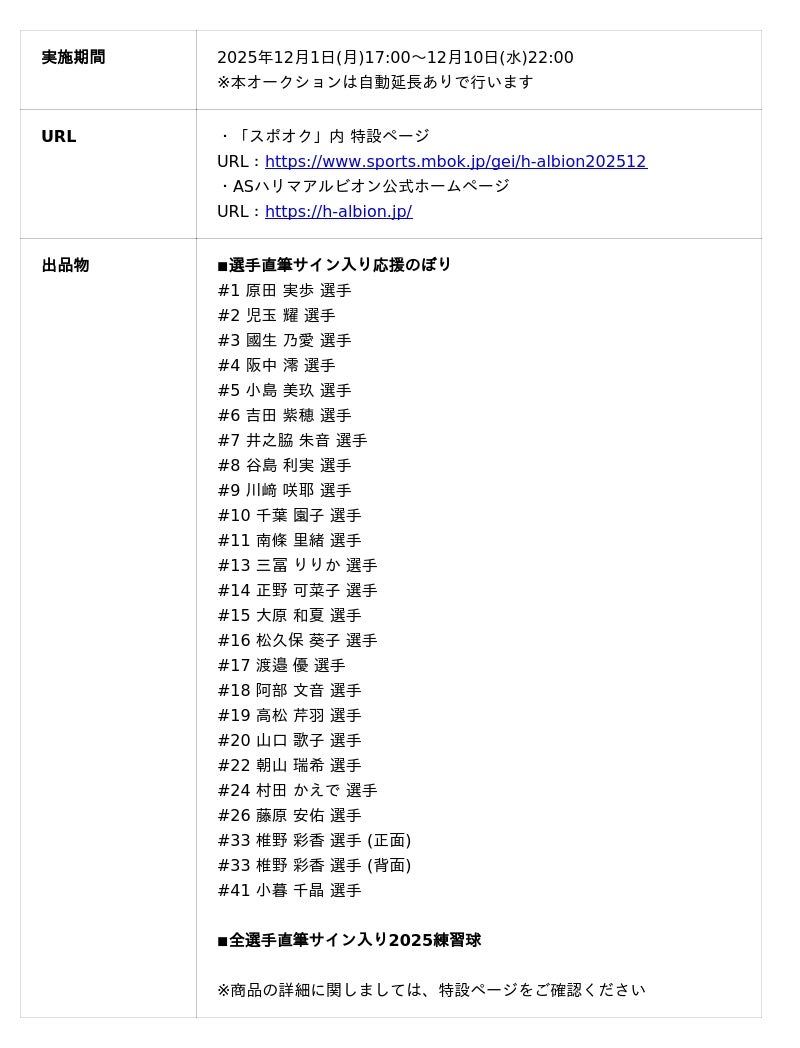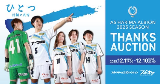 株式会社モバオク(本社:東京都渋谷区、代表取締役社長:小一原 宏樹、以下モバオク)がエンゲート株式会社(本社:東京都中央区、代表取締役:城戸 幸一郎、以下エンゲート)と業務提携し提供するスポーツチーム公式オークションサービス「スポオク」にて、日本女子サッカーリーグ、なでしこリーグ1部所属のASハリマアルビオンが2025年12月1日(月)より『ASハリマアルビオン 2025 SEASON THANKS AUCTION』を開始します。