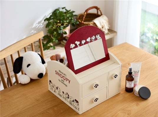 「卓上メイク収納ボックス『スヌーピー』」収納できるミラーを付けることで、化粧品を収納するだけでなくその場でメイクができる仕様としました。3つある引き出しの取っ手には可愛らしいスヌーピーの足跡のデザインを施しています。化粧水ボトルやメイクブラシを立てて収納できるスペースがあり、整理整頓も簡単に行えます。「欲しいインテリアグッズ」についてアンケ―トを取ったところ、