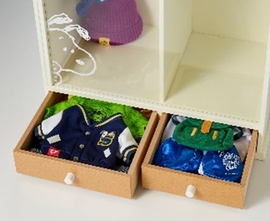 「ぬいぐるみ&衣装収納ケース『スヌーピー』」スヌーピーのぬいぐるみと、ぬいぐるみの衣装を一緒に飾って収納できる専用ケースです。PFCの特典や会員限定グッズとして購入できるぬいぐるみと衣装がぴったり収まるサイズで設計されており、スヌーピー以外のぬいぐるみを飾ることも可能です。