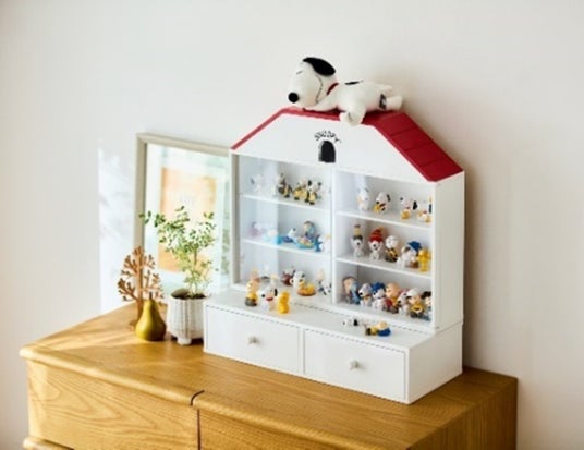 ファンからの「フィギュアなど、小さなコレクションアイテムを飾りながら収納できるものが欲しい」という声に応え、スヌーピーの犬小屋をモチーフにしたデザインを採用しました。屋根にはぬいぐるみを置けるようにし、フィギュアなどの小さなコレクションを「見せる収納」としてディスプレイすることを考え、ほこり予防のためのアクリル扉を付けました。また、スヌーピーが屋根の上で寝そべる姿を再現できるように、屋根の頂点を無くし、ぬいぐるみを配置しやすい形状に仕上げました。