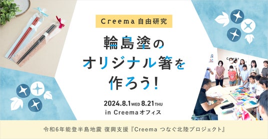 日本最大のハンドメイドマーケットプレイス「Creema(クリーマ)」を運営する株式会社クリーマ(本社:東京都渋谷区、代表取締役社長:丸林耕太郎)は、小学生向けの夏休み特別企画として「Creema 自由研究-輪島塗のオリジナル箸を作ろう-」を、2024年8月1日(木)・21日(水)の2日間にわたり開催いたします。本企画は令和6年能登半島地震 復興支援『Creema つなぐ北陸プロジェクト』の一環として実施するもので、ワークショップの売上の10%は輪島漆器商工業協同組合に寄付いたします。
