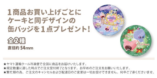 特典缶バッジはお選び頂いたケーキと同じデザインとなります。