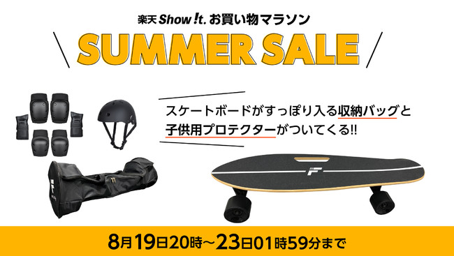 楽天市場「Show !t」は8月19日(金)20時から、パーソナルモビリティブランドMEISTER.Fから新発売の電動スケートボードをご購入すると、購入後届いたらすぐにスケートボードを練習できるキッズプロテクターと収納バックセットのプレゼントキャンペーンを実施します。リモコン操作で前後移動、重心移動で自由に方向転換するスケートボードで、新しい感覚の運転操作を楽しみましょう。また、8月19日(金)20時~8月23日(火)01時59分まで開催される楽天お買い物マラソンに参加し、全商品ポイント10倍プレゼント(一部商品を除く)を実施します。
