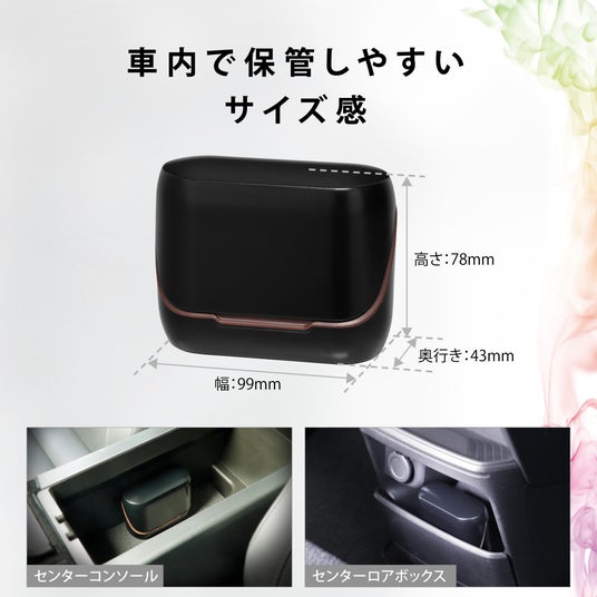 ドアポケットやセンターコンソールにすっきり収まるサイズ感(下画像:右)底面はフラット設計のため、縦置きで自立可能