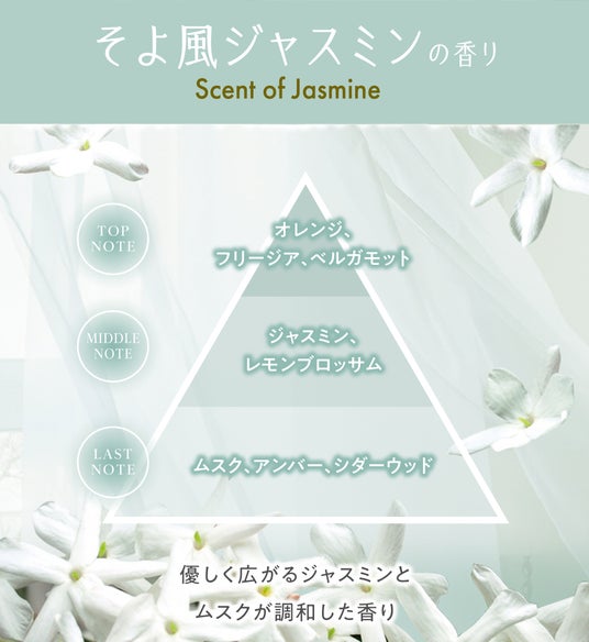そよ風に乗ってジャスミンの香りが柔らかく広がる昼下がりをイメージした優しいフローラルの香り