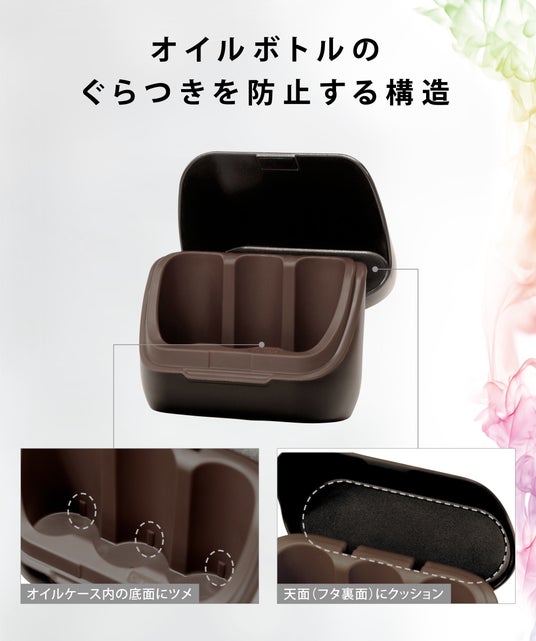 また、ユーザーからの「車での置き場所に悩む」という声を受け、複数のボトルを収納できる、耐香料素材を採用したオイルケースを開発しました。車内に置きやすいサイズと形状で、使いたいオイルの持ち運びに便利です。