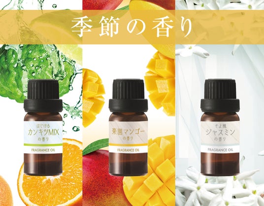 本製品は、関連アイテムの出荷累計数が300万個を超える(2025年5月現在)「噴霧式フレグランスディフューザー」シリーズ専用フレグランスオイルです。手軽にフレグランスオイルを交換できる特長を活かし、2022年より「キンモクセイ」や「沖縄パイナップル」「ホットゆず」「ミモザ」など、香りから季節の雰囲気を感じる「季節の香り」シリーズを展開。第5弾となる今回は、ECにおいて夏前に注目されていたキーワードやトレンドをふまえて香りを開発しました。爽快なシトラス、甘くジューシーなマンゴー、優しいジャスミン、とタイプの異なる3つの香りをお届け。クルマやお部屋で、ドライブのお供やお部屋でのリラックスタイムに、お好きな香りをお楽しみください。