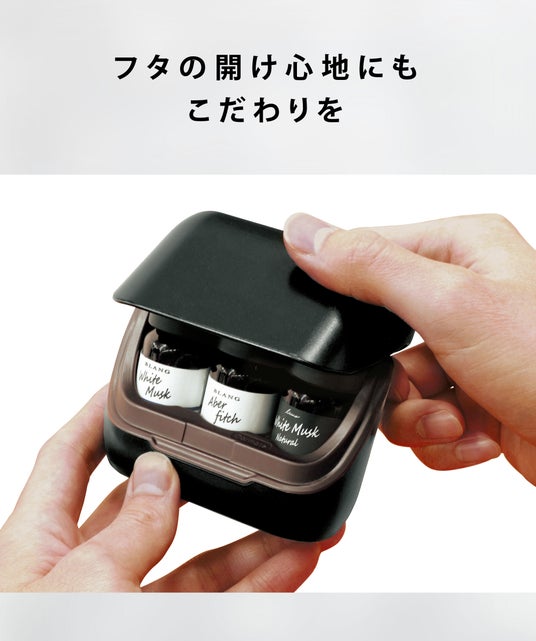 イヤホンケースのようなスタイリッシュなデザインマグネット式のフタで心地よく開閉可能。ボトルの出し入れしやすさにもこだわり、フタを最適な開閉角度に設計。開けた際にラベルが確認できるため、香り名が一目で分かる(下画像:左)当社フレグランスオイルのボトルカラーとの調和を意識したデザイン