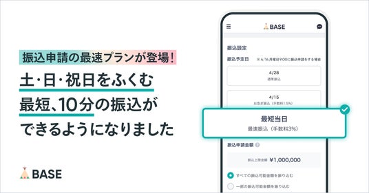 この度、BASE株式会社(所在地:東京都港区、代表取締役CEO:鶴岡 裕太、以下BASE)が運営するネットショップ作成サービス「BASE(ベイス)」は、「BASE」利用ショップのキャッシュフロー早期化をサポートするため、通常は売上金の振込申請から入金までに10営業日を要するところ、ストアフロント型ネットショップ作成サービスとして最速の最短10分で入金が完了する「最速振込」の提供を2025年4月15日(火)より開始しましたのでお知らせします。