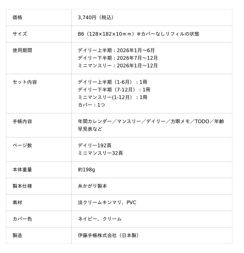 手帳カバーは新色のクリーム(新色)とネイビーの2色展開です。持ち運びやすさを重視した半年分冊型で、(上半期:2026年1月-6月 下半期:2026年7月-12月)タイプのデイリー手帳(B6)2冊と小型ミニマンスリー(A6)1冊がセットになっています。(