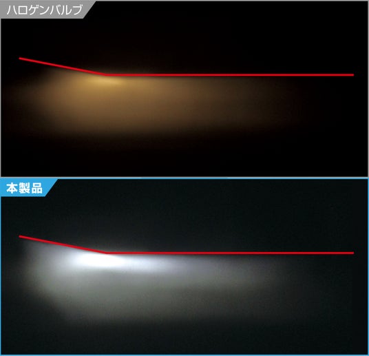新車検基準(ロービーム検査)対応ハロゲンバルブ同等のカットオフラインで対向車への眩しさを抑制しつつ、明るさを確保(下画像:右)