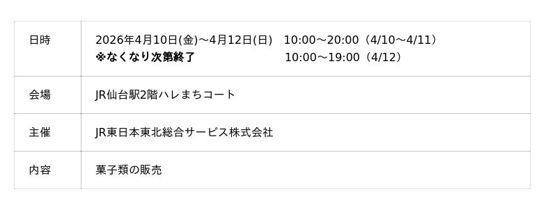 JR東日本東北総合サービス株式会社2026年4月10日(金)~4月12日(日)まで仙台駅2階ハレまちコートにて開催