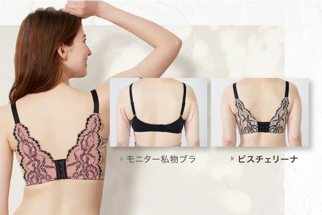 「着けた時の見た目も、服を着た時のシルエットも大好き!」とたいへん好評をいただいている、“じぶん史上最高バスト”に出会えるビスチェ風ブラ「ビスチェリーナ」。シルエットをキレイに見せる機能の高さから、芸能人やモデルの方々にも愛用いただいている人気ブラの特徴は、以下の4つとなります。