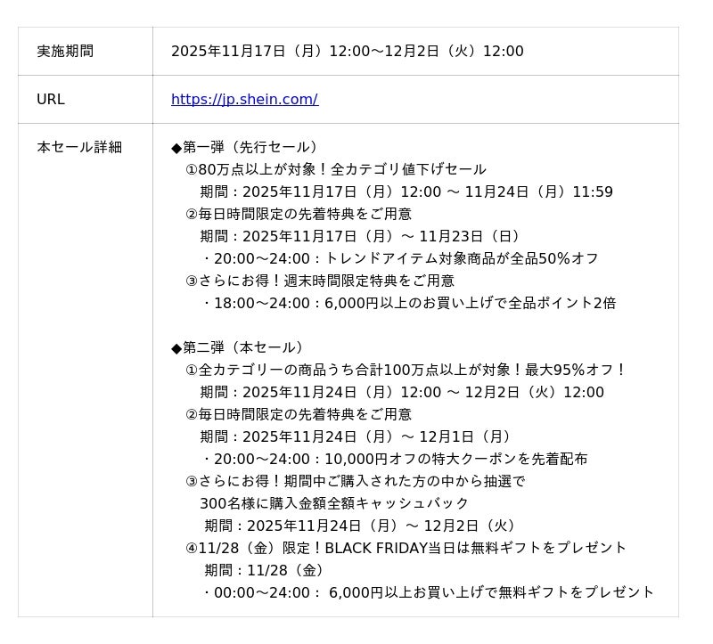 https://jp.shein.com/ 今回のセールは、2025年11月17日(月)~11月24日(月)までの第一弾(先行セール)と、同年11月24日(月)から12月2日(火)までの第二弾(本セール)の豪華2本立てで展開します。