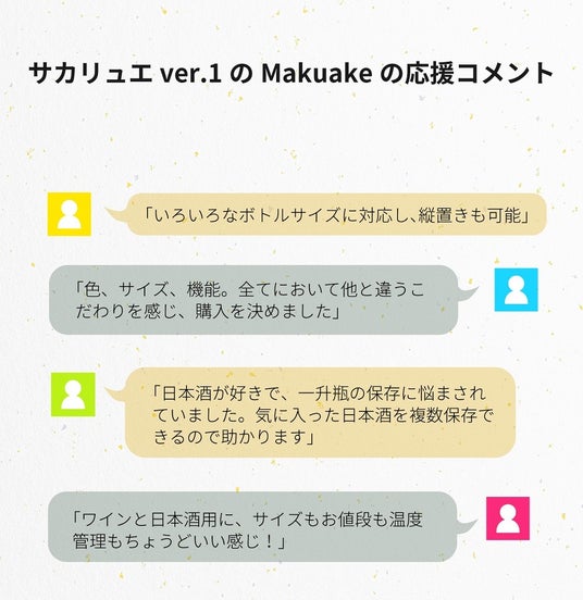 第1弾の「サカリュエ」は日本の住宅になじむスリムな設計や、一升瓶とシャンパンを同時に収納できるレイアウト、和の空間になじむ温もりのあるカラーも好評をいただき、目標金額を大幅に上回る応援をいただきました。