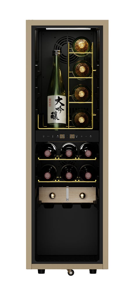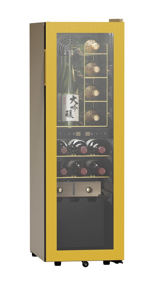 一升瓶もシャンパンも一緒に収納できるスリムなワインセラー「サカリュエ」の第2弾が登場! 第1弾からの進化ポイントはワインを熟成させるために庫内で水を気化させる「潤箱(うるばこ)」にあります。