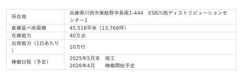 ■ 新拠点概要現在の西日本流通センター(兵庫県三田市)を移転し、2026年4月に新拠点での稼働を予定しています。移転先となる新拠点は、日本最大級の物流施設プロジェクト「ESR川西ディストリビューションセンター1」へ入居し、延べ床面積は4.5万平米(現センターの7.5倍)の広さを誇ります。また、搬送ロボットや自社開発のデジタルピッキングカートなどの自動化技術を積極的に導入することで、約40万点の在庫保有と、1日あたり10万行の出荷が可能となり、有事にも安定供給を継続できる体制を構築します。