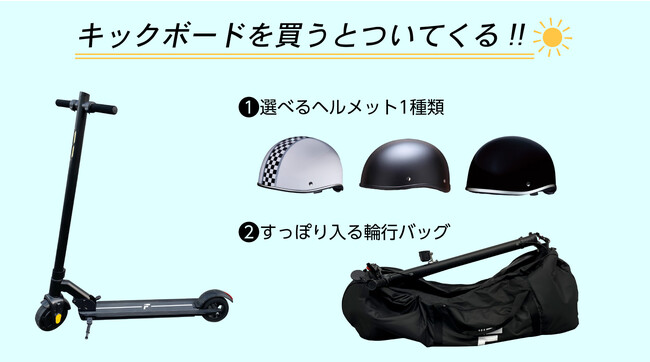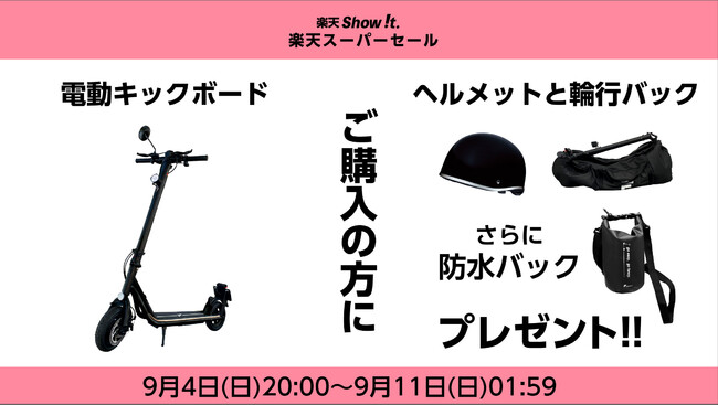 楽天市場「Show !t」は9月4日(日)20時開始、MEISTER.Fの電動キックボードをご購入すると、購入後届いたらすぐにキックボードがある生活を始められる10,000円相当のヘルメットと輪行バックのセットと、さらにショルダーストラップ付の防水ミニバックをプレゼントします。キックボードを取り入れて、近所へも快適に楽しく移動しましょう。また、9月4日(日)20時~9月11日(日)01時59分まで開催される楽天スーパーセールに参加し、全商品送料無料、ポイント10倍プレゼント(一部商品を除く)を実施します。