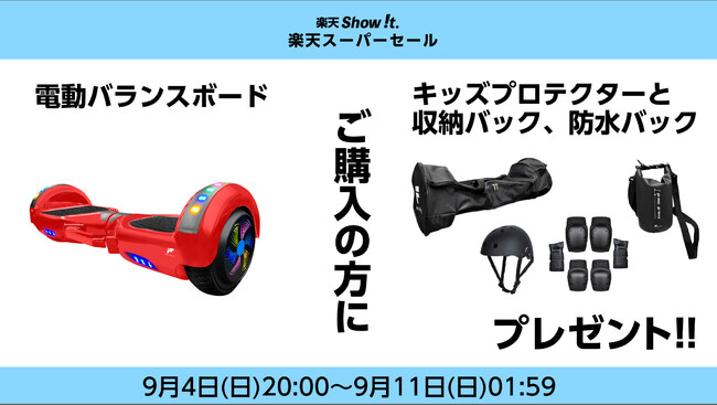 楽天市場「Show !t」は9月4日(日)20時開始、MEISTER.Fの電動バランスボードをご購入すると、購入後届いたらすぐにバランスボードを練習できる10,000円相当のキッズプロテクターと収納バックセットと、さらにショルダーストラップ付の防水ミニバックをプレゼントします。キックボードを取り入れて、近所へも快適に楽しく移動しましょう。また、9月4日(日)20時~9月11日(日)01時59分まで開催される楽天スーパーセールに参加し、全商品送料無料、ポイント10倍プレゼント(一部商品を除く)を実施します。