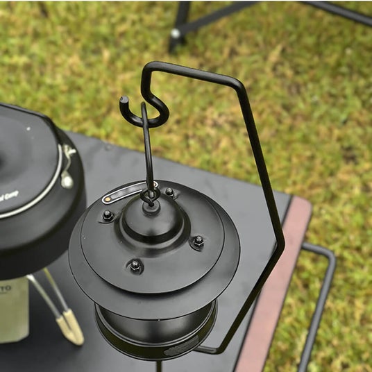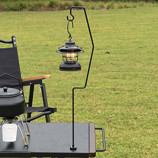 ロースタイルのキャンプに最適なスチール製のランタンスタンド。