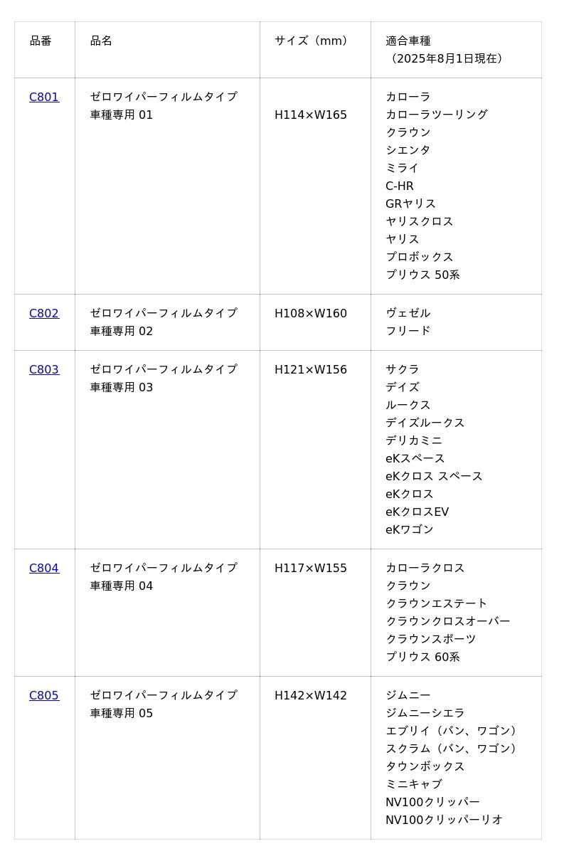 また、人気車種46種(※1)のドアミラー専用設計の「ゼロワイパーフィルムタイプ 車種専用01~05(C801~C805)」を、2025年8月28日(木)より当社公式オンラインストアにて、サイドガラス用フィルムをセットして、数量限定で発売します。