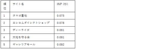 2025年を締めくくるINPトップ5は、タマゴ基地やエレコムなど、年間を通じて上位を維持した常連サイトが顔を揃えました。特筆すべきは、各社がLCP(表示速度)においても高速な数値を記録している点です。「操作への反応」と「表示」の双方で高水準なパフォーマンスを両立し、ユーザーにストレスを感じさせない快適な購買体験を提供しています。