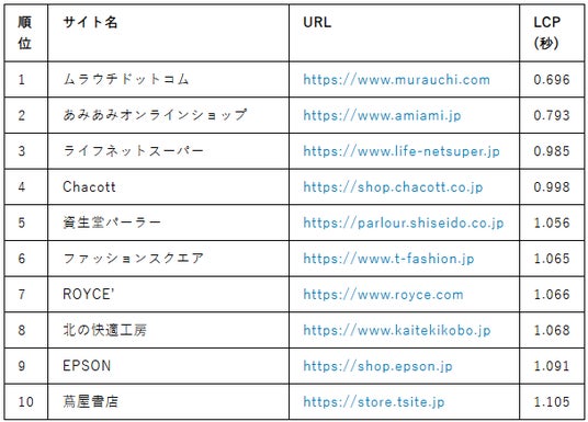 トップ10のサイトすべてがLCP(Largest Contentful Paint)1.2秒以下を達成していることです。特に、「ムラウチドットコム」、「あみあみオンラインショップ」、「ライフネットスーパー」、「Chacott」は1.0秒の壁を突破しており、表示速度に関しては最適な状態と言えます。