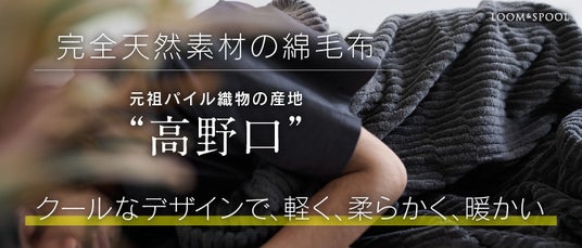 兵庫県尼崎市でインテリア商品企画、デザイン、マーケティングなどを行うパンダ企画。が2019年に立ち上げた自社ブランド「LOOM&SPOOL」。デザイナーである代表が、国産毛布の90%近くを生産し「毛布のまち」と呼ばれる大阪府泉大津市の老舗工場・森弥毛織株式会社に相談を持ちかけ、国内生産の高い品質とデザイン性を兼ね備えた毛布を開発。日本の住環境と現代のインテリアに調和する「新しい毛布」を展開しています。