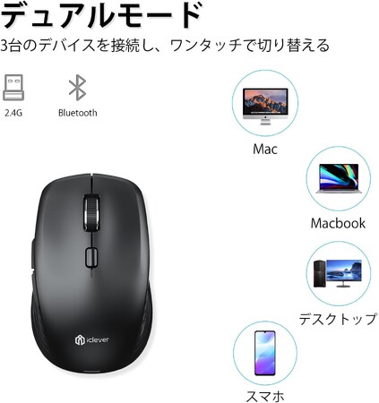 https://www.iclever.co.jp/products-wireless-mouse/md179「MD179」はBluetooth接続のほか、USBレシーバーをデバイスに差し込むことによって使用できる2.4GHz接続にも対応しています。