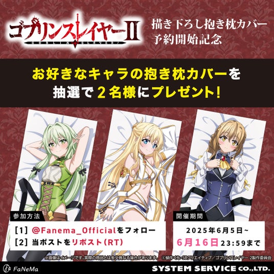 システムサービス株式会社(本社:東京都豊島区、代表取締役社長:田村宗弘)は、アニメ・マンガ・ゲーム作品等のキャラクター商品の企画・製作・販売をする自社ECサイト「FaNeMa」(URL:https://fanema.jp/)にて、TVアニメ『ゴブリンスレイヤーII』より「抱き枕カバー」を発売いたします。さらに、新商品発売を記念したX(旧Twitter)フォロー&リポストキャンペーンも実施いたします。