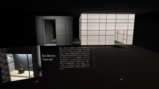 Apple Vision Proが持つアイトラッキング(視線追跡)機能を活用し、各展示作品の作品名に視線を合わせて指でタップすると展示作品の詳細説明を閲覧することができます。本アプリでは、「Ambient Weaving II」で展示された、織物の表面と影が異なる様態を示す織物「WP006 <Iridescence>」や光源との位置関係や温度変化といった複数の環境要素によって意匠が変化する掛け軸「Jiku」、織物による茶室「織庵」など、計10点の作品を楽しむことができます。