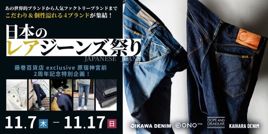 “日本”をテーマにした珠玉の逸品に出会えるECサイト「藤巻百貨店」(運営会社:株式会社caramo)のリアル店舗「藤巻百貨店 exclusive 原宿神宮前」は、2024年11月にオープン2周年を迎えます。これを記念し、スペシャル企画「日本のレアジーンズ祭り」を開催いたします[開催期間:2024年11月7日(木)~11月17日(日)]。日本が世界に誇る超人気デニムブランドをはじめ、ジーンズの聖地・倉敷児島発のファクトリーブランド等、こだわり&個性溢れる4ブランドが大集結。幻のジーンズ再販や、前代未聞のデニム生地を使ったパンツの先行販売のほか、ここでしか手に入らない限定ジーンズも。デニム初心者からマニアまで見逃せない逸品が並びます。