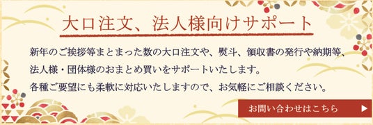 また、法人様・団体様向けに、まとまったご注文への対応や、熨斗掛け、領収書の発行、納期のご相談など、ビジネスシーンでのお年賀手配をサポートも承っております。